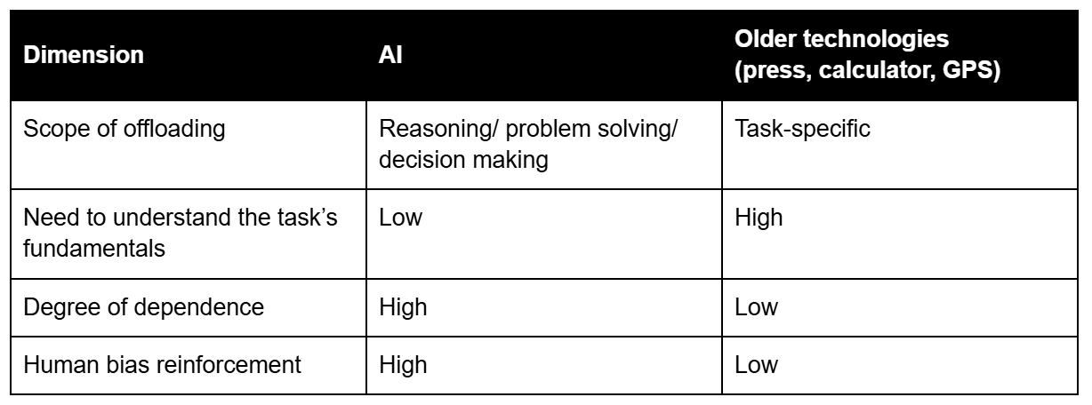 First of all, previous technologies primarily served as tools to enhance cognition while requiring human interpretation. GenAI models, which can independently produce text, code, images and decisions, have the potential to replace cognitive tasks, not just augment them. As a result, AI’s offloading scope is broader and reaches as far as reasoning, problem-solving, creativity and decision-making. This can lead to a higher degree of atrophy and dependence on AI. Second, while older technologies reduce the burden of specific tasks, they still encourage active cognitive engagement in other ways (e.g, reading enhances comprehension, calculators still require understanding of mathematical principles, etc.). In contrast, users may rely easier on AI for decisions without fully understanding the underlying task and its logic, leading to a decline in critical thinking. Third, AI evolves and adapts to the information provided by the user, which in turn may reinforce biases and prevent diverse thinking. On the other hand, calculators and GPS are static.