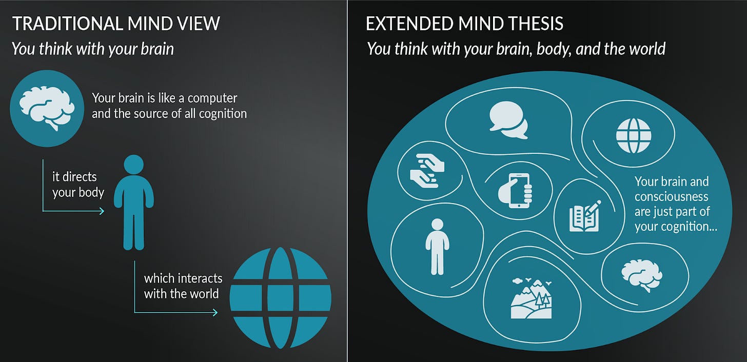 In 1998, the philosophers Andy Clark and David Chalmers presented the extended mind theory. According to this theory, tools that humans use to aid cognition can become parts of their mind. They use the example of a notebook as an integral part of a cognitive process for a fictional character, Otto, who has Alzheimer's. Otto uses a notebook to record information he can't retain in his memory. In this case, the notebook acts as a part of the character’s mind, similar to the role of a biological memory. This can be extended to technologies such as the smartphone or LLMs.