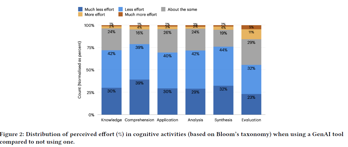 A few days ago, researchers at Carnegie Mellon and Microsoft published a study on the impact of GenAI on critical thinking among knowledge workers. The research found that while GenAI reduces cognitive effort, it can also decrease critical thinking. Higher confidence in GenAI correlated with less critical thinking, which occurred more in younger participants.